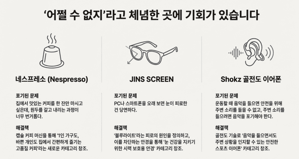 제가 주목하는 것은 경쟁자가 아니라, 사람들이 속으로 ‘원래 그런 거지’라고 받아들이며 묻어둔 불편함입니다. 누구나 느끼지만 아무도 해결될 거라고 기대하지 않는 그 문제들. 굳이 표현하자면 ‘체념된 문제’, 혹은 ‘숨은 불편’에 가깝습니다. 사람들은 불만이 있어도 말로 잘 드러내지 않습니다. 불편을 해결할 방법이 없다고 생각하는 순간, 그 문제는 시장에서 사라져버립니다. 하지만 이 지점이야말로 새로운 기회가 만들어지는 출발선입니다. 경쟁이 아닌 창조가 일어나는 공간이 바로 여기에 놓여 있습니다.