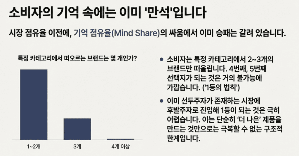 경쟁이 너무 익숙해진 시대입니다. 우리는 당연하다는 듯이 더 좋은 제품, 더 낮은 가격, 더 많은 기능을 갖추면 자연스럽게 성장할 것이라 믿습니다. 하지만 이미 자리가 꽉 찬 시장에서 이런 방식으로는 더 이상 의미 있는 성장을 기대하기 어렵습니다. 소비자의 머릿속에는 이미 몇 개의 브랜드만이 남아 있고, 그 기억의 벽을 넘는 일은 생각보다 훨씬 어렵습니다. 어제보다 조금 더 나은 제품을 만드는 것만으로는 미래를 열 수 없다는 사실을 받아들여야 합니다.