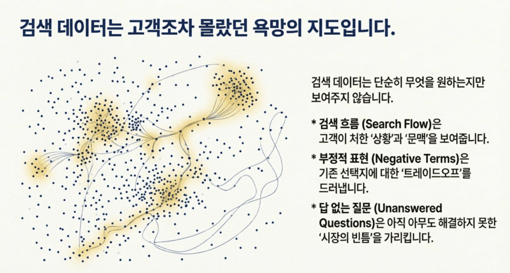 문제는 사람들이 이 순간을 직접 말해주지 않습니다. 이 상황에서 검색 데이터가 강력한 힘을 가집니다. 사람들은 말하지 않는 고민을 검색창에 솔직하게 남깁니다. 귀찮음, 불만, 대안 찾기, 실패 경험 등 일상 속에서 묻어두던 감정이 가장 가감 없이 드러나는 곳이 바로 검색 기록입니다. 검색 흐름을 따라가 보면 사람들이 어떤 상황에서 어떤 고민을 하다가 어떤 선택으로 이어지는지 선명하게 볼 수 있습니다. 검색어가 클러스터를 분석하다보면 종종 우리는 존재하는지조차 몰랐던 시장의 빈틈을 발견하곤 합니다. 이 빈틈이 곧 새로운 카테고리가 자라날 수 있는 자리입니다.