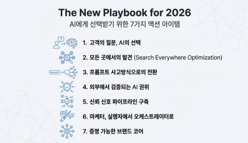 링크를 얻는 시대에서, 정답이 되는 시대로. 실행자로서 일하는 시대에서, 오케스트레이터로서 설계하는 시대로. 기계가 모든 것을 만드는 시대에서, 인간이 ‘증명 가능한 경험’으로 신뢰를 쌓는 시대로 이동하며 발생하는 이 모든 변화를 한 문장으로 축약해본다면 “2026년의 마케팅은 더 많이 보이기 위한 기술이 아니라, AI가 대신 결정해도 안전하다고 믿을 수 있는 브랜드를 설계하는 일이다.” 라고 할 수 있을 것입니다.