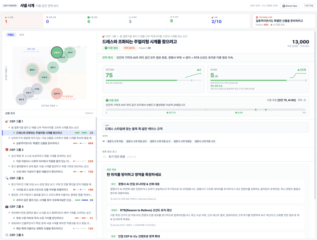 예를 들어 아래는 ‘백하새우젓’이라는 제품의 CEP 대시보드의 이미지입니다.각 상황 또는 상황×목적 단위 옆에 인간 정신 가용성과 인공지능 단계가 색이나 막대로 표시되고. 화면 전체는 상황의 확장 구조와 점유 강도를 동시에 보여주는 브랜드 지형도로 작동합니다. 경영진은 이를 통해 방어 구간, 경쟁 점유 구간, 기회 영역을 즉시 파악할 수 있습니다.