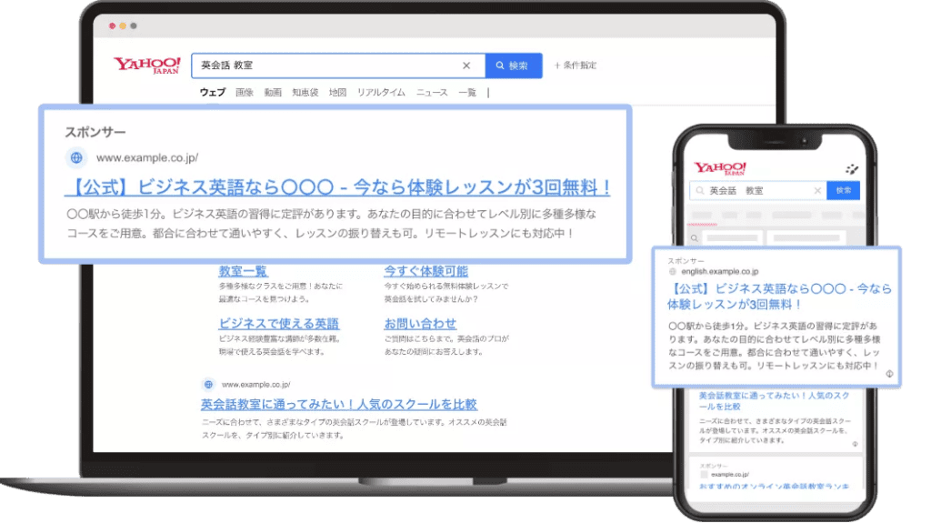 야후 광고는 검색과 디스플레이 2가지 타입이 있습니다. 야후 광고는 일본 내 사용자 데이터를 기반으로 연령・지역・관심사・행동 데이터 등 세분화된 타겟팅이 가능합니다. 특히 디스플레이 광고에서 정교한 타겟팅 설정이 강점입니다.