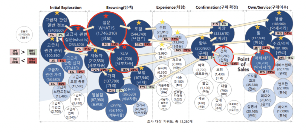 검색 데이터를 바탕으로 리스닝 마인드 솔루션이 비쥬얼라이즈 한 구매 이전과 이후의 소비자 인텐트 맵입니다. 이 맵을 통해서 마케터는 소비자들이 기업에게 무엇을 묻고 요구하고 있는 지를 정확하게 파악할 수 있습니다. 고객 퍼넬 안의 소비자들이 가진 마이크로 인텐트들이 퍼넬을 이동하면서 어떻게 변화가는 지를 자사 브랜드, 경쟁 브랜드, 시장 전체 레벨로 한 눈에 확인할 수 있습니다.